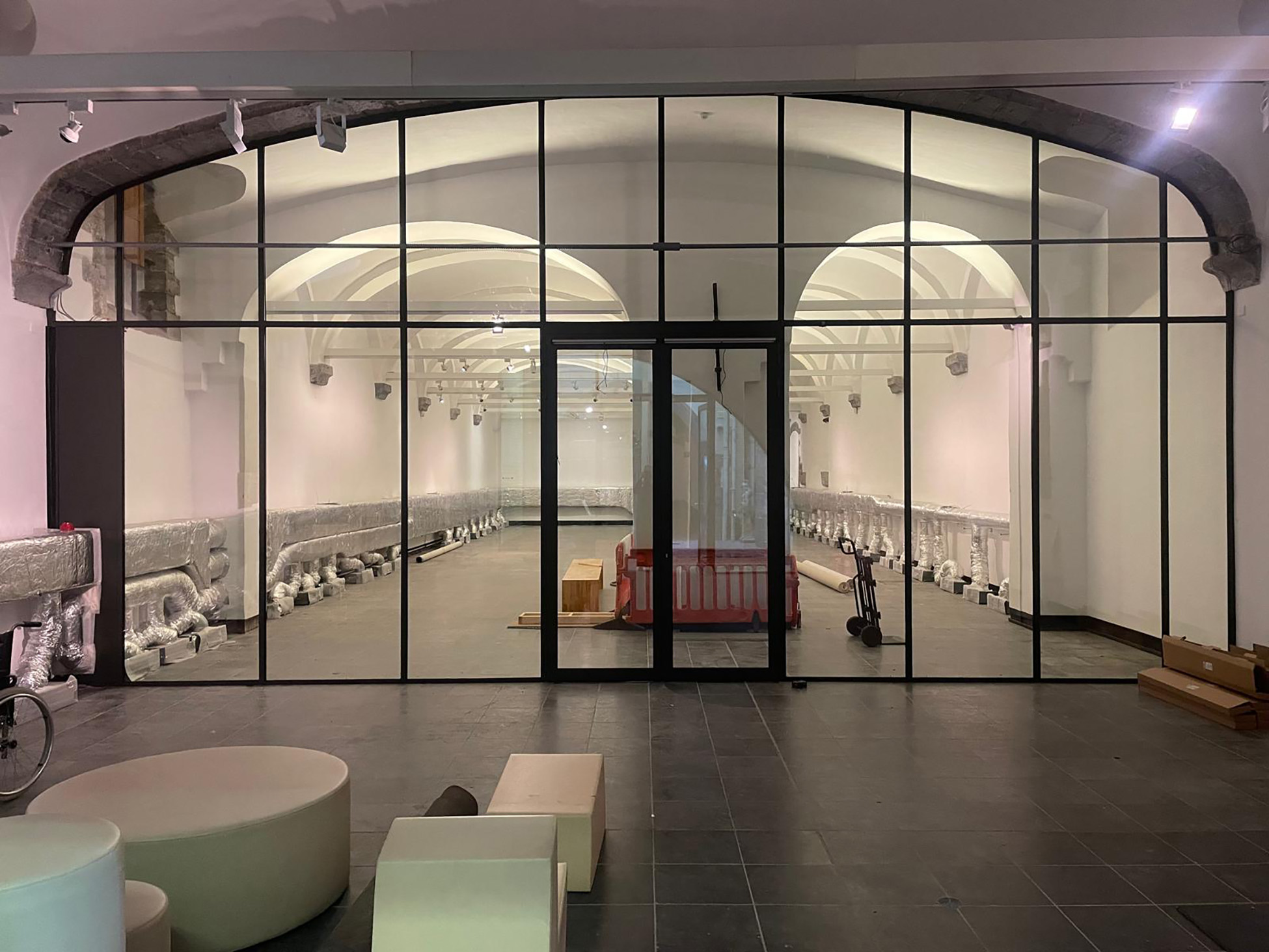 The intervention respects the original rhythmic division of the bays and provides the space with a flexible hanging system for paintings, drawings, tapestries, etc….